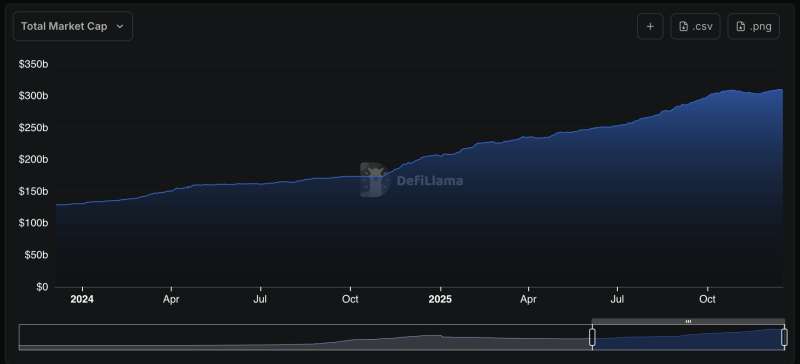 Stablecoinien osalta kasvu ollut vähän maltillisempaa. Noin 50% kasvua tälle vuotta. Toki rahaa alkaa olla jo ketjuissa sisällä sen verran paljon (noin 300 miljardia dollaria), että ei se kasvu voi satoja prosentteja olla joka vuosi.
