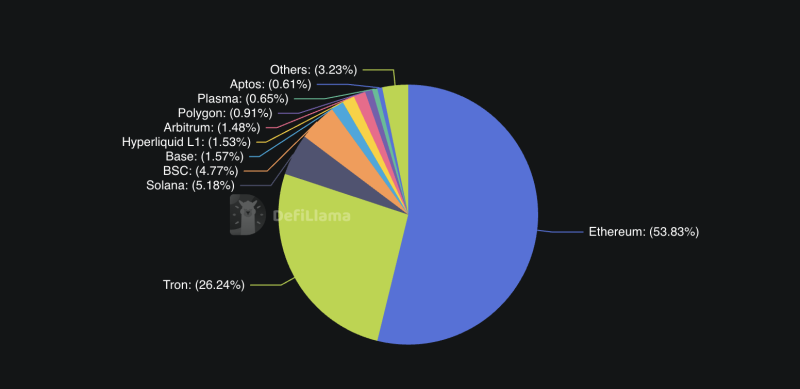 Ja tietysti stablecoineissakin Ethereum on se ketju, mihin ne pääasiassa menee. Vaikka Tron toki on esim itäisissä maissa suosittu rahojen siirtely ketju, ja siksi toisena listalla.