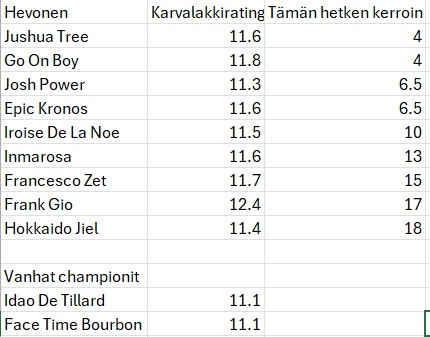 3 Kanto Avis Oli viimeksi johtavan rinnalla ylikovassa avauksessa ja taipui ymmärrettävästi. Unohda tuo startti. Sitä ennen edellisen kerran ilman kaikkia kenkiä 5v. – Criteriumissa, missä taipui johtavan takaa pahoin. Kerää usein paljon peliä, mutta ei ole säväyttänyt. Tuntuisi, että ei ole saavuttanut huippukuntoaan syksyn starteissa. Menestys yllättäisi, vaikka on hevosena ihan ok tällaiseenkin lähtöön.