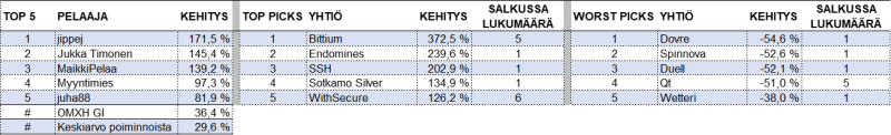 Parhaat yhtiöt foorumin poiminnoista ovat SSH, Endomines, Bittium, WithSecure ja HKFoods. Täytyy sanoa etten ollut ihan hirveän lähellä osua itse. Minun rivini on edelleen yhteensä 2 % pakkasella, ja kaksi kolmesta nimestä on miinuksella, eli hylky tulee. Foorumin poiminnat keskimäärin ovat melkein pysyneet indeksin perässä, mutta indeksi menee vielä hitusen edellä. Vieläkö saadaan indeksi kiinni loppuvuonna?