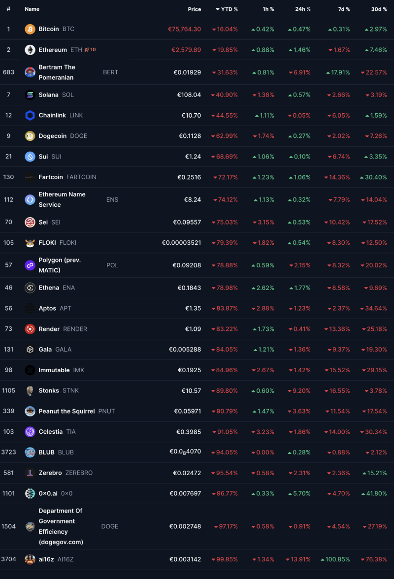 Katselin huvikseen muutamia kiinnostavia listalta, niin vuodest alusta huiput olivat mm. SUI +30%, ENA +44%, fartcoin +189%, ai16z +48%, sekä perälautana oma picki zerebro +36% :D