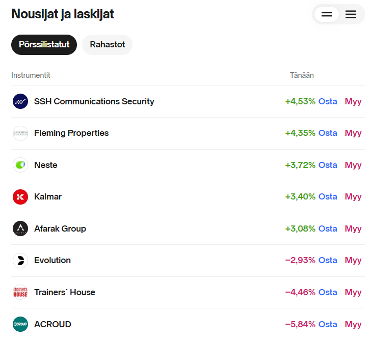 Se aika on täällä. Avaan päiväni yleensä Nordnetin yleisnäkymällä ja sieltä vilkaisen myös fokusyhtiöiden viisi suurinta nousijaa ja viisi laskijaa ja niiden pörssikurssit. Jos vaikka vastapalloon painaisi. Momentum-Matikainen tekee saman, mutta se on lukenut seinätaulumme 90-luvulta "Don't Buck the trend, because the triend is your friend" ja ostaa miun laput tai tuuppaa miulle syliin omansa.