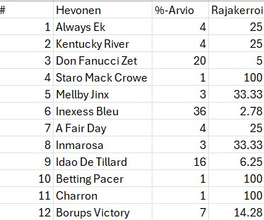 Onko Falcolla (tai miksei muillakin) käsitystä lauantain UET Grand Prix ranskalaisten hevosten voimasuhteista verrattuna ruotsalaisiin? On kyllä jotenkin itselle niin hankala suhteuttaa kun en seuraa tuota Ranskan raviurheilua. Katsoin kyllä tuon Lovino Bellon lopulta voittaman karsinnan mutta enpä tullut hullua hurskaammaksi. :D ATG:llä on ainakin alustavasti ruotsalaisiin hevosiin luottoa. Jotenkin itsellä mielikuva että Ranskassa olisi suvantokausi menossa näiden ikäluokkahuippujen suhteen kun Epic Kronoskin voitti viime vuonna kuolemalta helposti tuon UET GP:n.