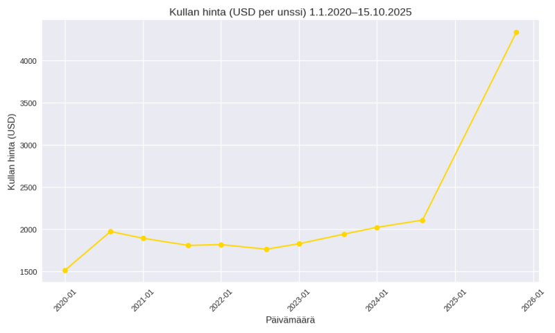Kullan hinnan kehitys 2020/01 - -2025/10