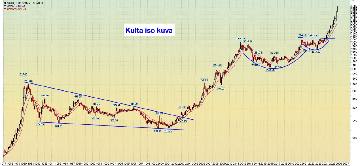 Pitkä kuva kertoo, että on sitä kullassa ollut kovaa maniaa ennenkin. Esim. vuonna 2001 alkoi 11 vuotta kestänyt kova nousu. Nyt on ponnisteltu ylös pari vuotta. Vuosina 1977-1980 noustiin vielä parabolisemmin kuin nyt.