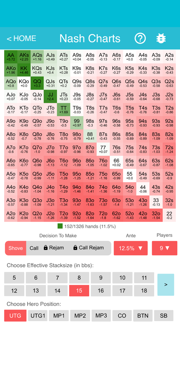 Ok, anten kanssa range laajenee, mutta vain hieman, käytännössä TT:hen. (sanoin myös alkuperäiseen vastauksen vähän väärin, siinä ei kaikki ässäsuitedit ollut puskuja, vain about A9s+ ja A5s ja AJo+).