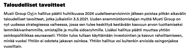 Kävisikö esimerkiksi Musti & MIrri, jonka jatketussa julkisessa ostotarjouksessa jäätiin lopulta vähän yli 80 % osuuteen. Osinkoasia ratkaistiin näin (tilinpäätös näytti tuolloin EPS 0,20 euroa voittoa):