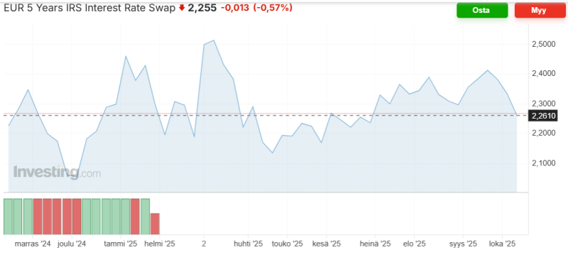 Kiinteistösijoitusyhtiöiden velat ovat tyypillisesti keskipitkiä, usein 5–10 vuoden mittaisia. Näin ollen 5 vuoden swap toimii luonnollisena referenssinä, koska se kuvaa parhaiten keskimääräisen velkaportfolion korkoriskiä. Näin ollen loogisesti kun 5v swap laskee, yhtiöiden tulevat korkokustannukset laskevat tai niiden diskonttokorot pienenevät joten edelleen loogisesti omaisuusarvot nousevat ja osakekurssit reagoivat.