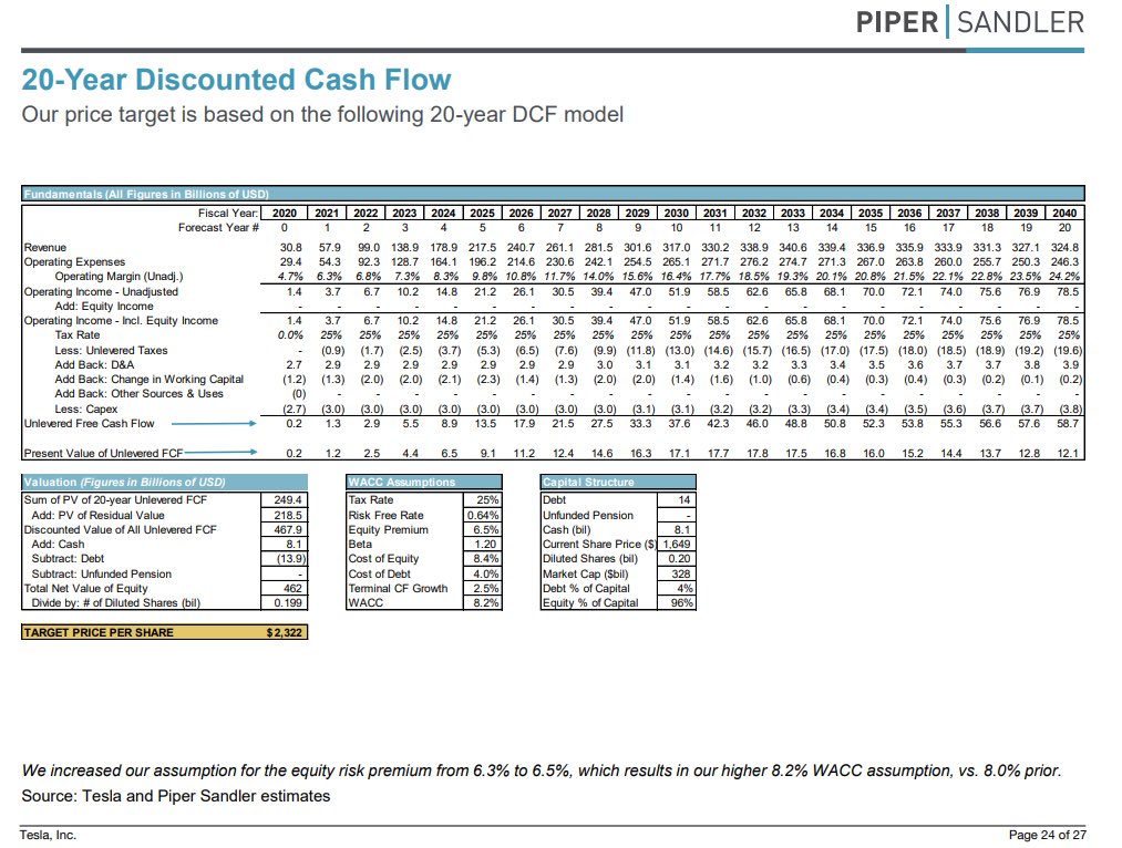He antavat tuolle FSD-softamyynnille vielä paljon minua isomman painoarvon ja ennustavat 90% katetta softapuolelta. En ole ihan samaa mieltä kaikesta mitä tuossa lukee ja ihmettelen erityisesti mihin he unohtavat kaikki muut softamyynnit laskelmistaan. Lisäksi tuo laskelma ei huomioi, että uusia automalleja tulee nykyisten rinnalle. En myöskään käsitä miksi nämä analyytikot eivät edelleenkään tajua tuota energiasektorin softapuolta lainkaan. Missään ei edes mainita sitä vaikka siellä on se kaikista suurin kasvu ja Teslan tuotekehitys on alkanut lopulta tuottaa valmiita ratkaisuja energiapuolella. Ei varsinaisesti yllätä, että Wall Street on teknologiajutuista pihalla, mutta silti aika kovia target-hintoja he saavat aikaiseksi näköjään. Oma $1500 fair value laskelmani on Piper Sandleriin nähden jo melkoinen bear case.