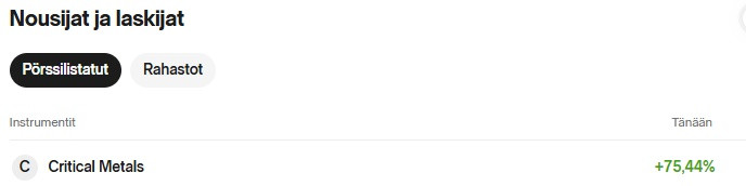 Tänään salkussa myös oleva Critical Metals on näköjään ottanut pre-marketissa hiukan spurttia myös (kun Mr. Trumpin administraatio on siihen silmänsä iskenyt).