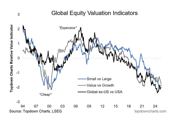 USA:n omaisuuserät käyvät kauppaa ennätyskorkealla yhteenlasketulla tasollaan. Tämä on selvästi korkeampi kuin vuonna 2021 ja jopa jonkin verran ylittää dot com -huippujen ja ennen globaalia finanssikriisiä vallinneiden huippujen tason. Samaan aikaan globaalit omaisuuserät ovat USA:aan verrattuna halpoja (DM/EM/FM-osakkeet, EMFX ja EM-obligaatiot).