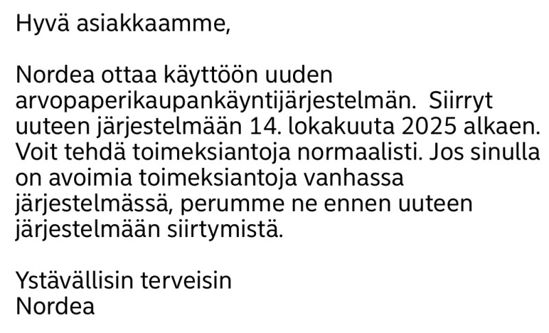 Kylläpä on taas käyttäjäystävällisesti hoitanut Nordea tämänkin muutoksen. Ei muuta kuin näpyttelemään toimeksiantoja. Prkl.