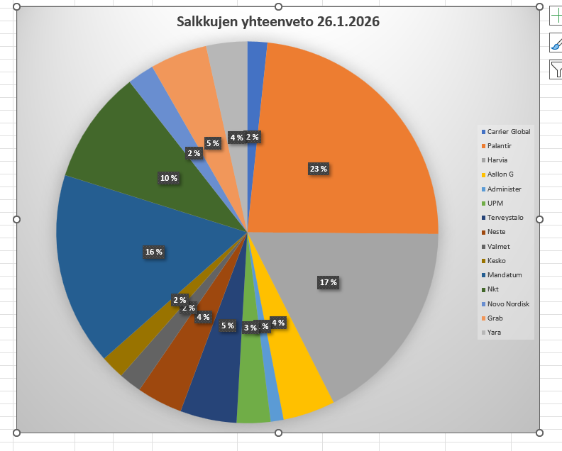 Muuten salkku on Q4 aikana ollut aika hiljainen. Palantir & Grab valuneett, TT noussut vähän, Novo ottanut ison osan tappioista takaisin ja Neste noussut hyvin. Muuten positiot sahanneet paikallaan.