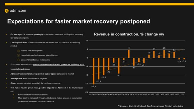 Rakennusalan haastava markkinatilanne on vaikuttanut jatkuvan vuosilaskutuksemme (ARR) kasvun toteutumiseen suhteessa alkuperäisiin suunnitelmiimme. Markkinoiden elpymistä vuoden jälkimmäisellä puoliskolla ei tapahdu odotetussa laajuudessa, ja asiakkaiden poistuma konkurssien seurauksena on pysynyt korkealla tasolla koko vuoden ajan.