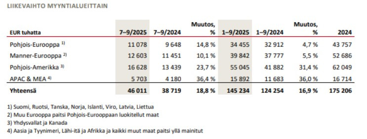 APAC & MEA oli voimakkaimmin kasvava myyntialueemme kolmannella neljänneksellä – sen liikevaihto kasvoi 36,4 %. Kasvu muodostui laajasti alueen eri markkinoista, mikä tuki tavoitettamme kasvaa APAC & MEA -alueella kestävästi ja vähentää samalla riippuvuutta yksittäisistä maista. Näemme alueella edelleen merkittävää potentiaalia ja jatkamme systemaattista työtä vahvistaaksemme edellytyksiä pitkän aikavälin kasvulle.