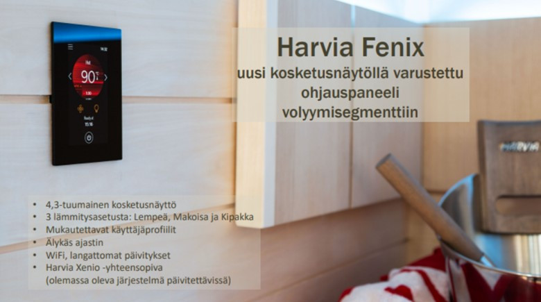 Tuotekehitysputkesta nostettiin esiin Harvia Fenix. Kieltämättä houkuttaa itseänikin ostamaan. Enkä varmasti ole ainut. Tämä on Harvialle iso mahdollisuus saada enemmän irti olemassa olevasta laitekannasta, vaikka kiukaita ei vielä tarvitsisikaan päivittää. Oletettavasti ohjauspaneeli toimii ainoastaan Harvian kiukaissa, jolloin jokainen ostettu paneeli myös sitoo asiakkaita Harvia-käyttäjiksi pidemmäksi aikaa. Harvia on lanseerannut myös tähän sopivan Appin MyHarvia 2:n.