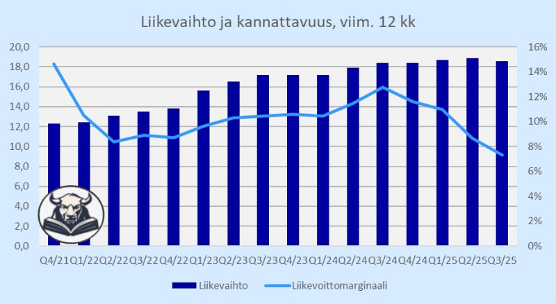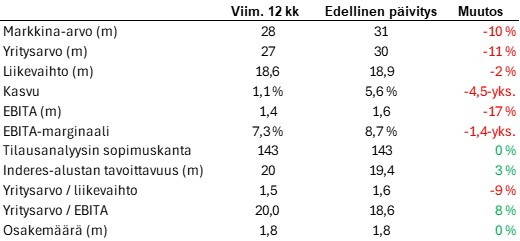 Ei ole Inderes-sijoitus toiminut vieläkään. Osake on edellisestä päivityksestä valahtanut 10 % lisää ja lukujenkaan valossa ei näytä juuri positiivisemmalta. Liikevaihto on kuin sisään päin kasvava kynsi, eli kasvaa väärään suuntaan ja hiertää inhottavasti. Kannattavuuskin on heikentynyt, jolloin liiketulos (EBITA) on laskenut reippaasti.
