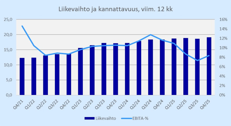 Ohjeistus: Liikevaihto kasvaa (2025: 19,1m) ja EBITA-% on 10-13 % (2025: 11,4 %). Ohjeistuksessa tutut maltilliset odottamat päätuotealueiden kasvusta ja kansainvälisten investointien negatiivisesta vaikutuksesta EBITAan.