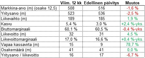 Osake on pysytellyt suht samoilla tasoilla, kuin edellisessä päivityksessäni. Ja niin on liiketoimintakin. Kasvua saatiin tällä neljänneksellä 8 %, mutta viimeisen 12kk ikkunassa vain reilu 5 %. Kannattavuus on jonkin verran toivottua matalammalla, mutta koska tämä edelleen johtunee investoinneista brändiin, olen asian kanssa kohtalaisen sinut. Kasvua vain pitäisi saada selkeästi nykyistä enemmän, vaikka markkinatilanne onkin haastava.