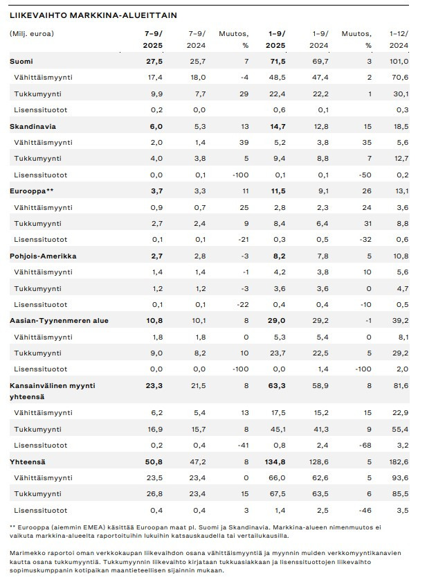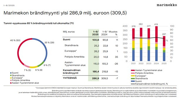 Markkinanäkymistä: Vuonna 2025 liikevaihdon Aasian-Tyynenmeren alueella, yhtiön toiseksi suurimmalla markkinalla, odotetaan olevan suunnilleen edellisvuoden tasolla tai kasvavan hieman. Merkittävä osa Marimekon lisenssituotoista vuonna 2024 kirjattiin Aasian-Tyynenmeren alueen liikevaihtoon, joten yhtiön lisenssituottojen arvioidun laskun vuonna 2025 ennakoidaan vaikuttavan heikentävästi markkina-alueen liikevaihtoon.