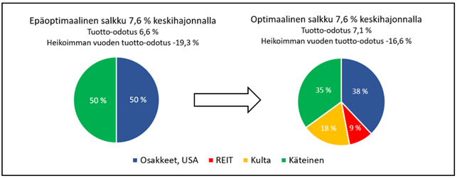 Kuva 3. Epäoptimaalinen yhdysvaltalaisosakkeista ja käteisestä koostuva salkku ja optimaalinen hajautettu salkku 7,6 prosentin keskihajonnalla, kun käytettävissä on käteisen lisäksi neljä omaisuusluokkaa (yhdysvaltalaiset osakkeet, muun maailman osakkeet, REIT, kulta). Datalähde: Portfolio Visualizer.