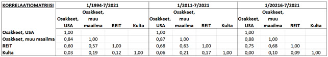 Taulukko 2. Omaisuusluokkien välinen korrelaatio kolmen eripituisen jakson aikana. Datalähde: Portfolio Visualizer.