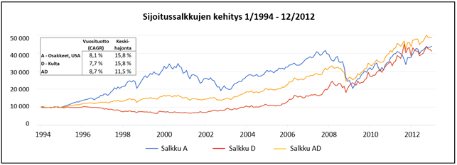 Kuva 5. Salkun A (Osakkeet, USA), salkun D (Kulta) ja salkun AD (Osakkeet, USA; Kulta) kehitys 1/1994 - 12/2012 (salkussa AD omaisuusluokilla yhtäläiset painot ja tasapainotus vuosittain). Datalähde: Portfolio Visualizer.