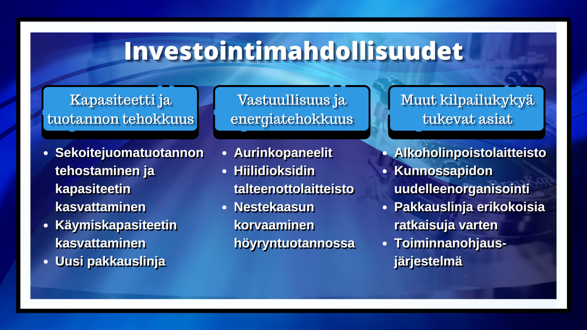 Mahdolliset investointikohteet yhtiö on jakanut kolmeen kategoriaan. Niistä ”Kapasiteetti ja tuotannon tehokkuus” on varsin helppo ymmärtää. Jatkaakseen kasvuaan Nokian Panimon täytyy myös jatkossa panostaa valmistuskapasiteetin kasvattamiseen. Tarkastelussa ovat sekoitejuomatuotannon (lonkerot ja virvoitusjuomat) kapasiteetin ja käymiskapasiteetin (oluet) kasvattaminen. Uusi pakkauslinja taas nostaa tölkityskapasiteettia ja tarjoaa uudenlaisia pakkausratkaisuja.