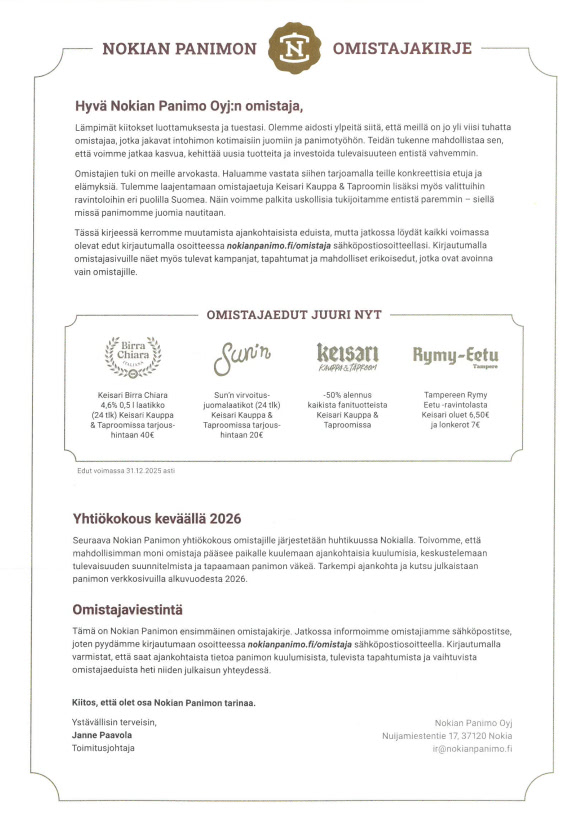 Esimerkki tästä nähtiin joulukuussa, kun Nokian Panimon omistajat löysivätkin postilaatikostaan kirjeen yhtiöltä. Kirjeessä oli omistajakortti, jolla saa alennuksia yhtiön omasta kaupasta sekä tietyistä ravintoloista, kiitokset yhtiön tukemisesta ja kutsu huhtikuun yhtiökokoukseen.