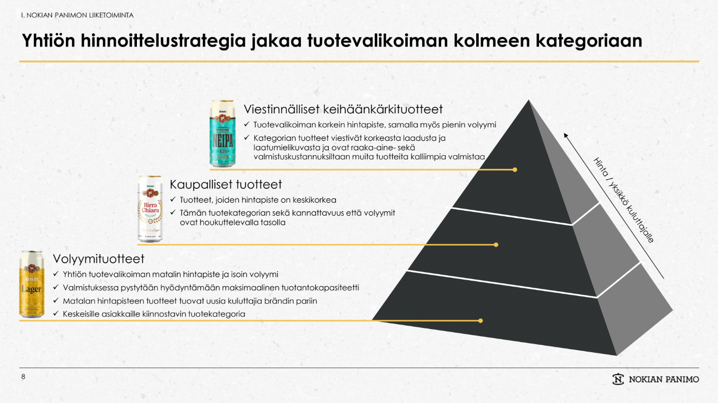 Vientiä emme tällä hetkellä suunnittele tarkemmin. Näemme että Suomen markkinassa on hyvin kasvumahdollisuuksia Nokian Panimon kokoiselle toimijalle. Panimotuotteet painottuvat vahvasti paikallisiin brändeihin ja paikalliseen tuotantoon, jolloin laajentuminen ulkomaille voisi todennäköisemmin toteutua yritysjärjestelyjen kautta, mutta myöskään yritysjärjestelymahdollisuuksia ei tällä hetkellä etsitä aktiivisesti. Markkinaosuutemme on kuitenkin tällä hetkellä kategoriasta riippuen noin 1–2 %, eli näemme paljon kasvun mahdollisuuksia kotimaan markkinassa.