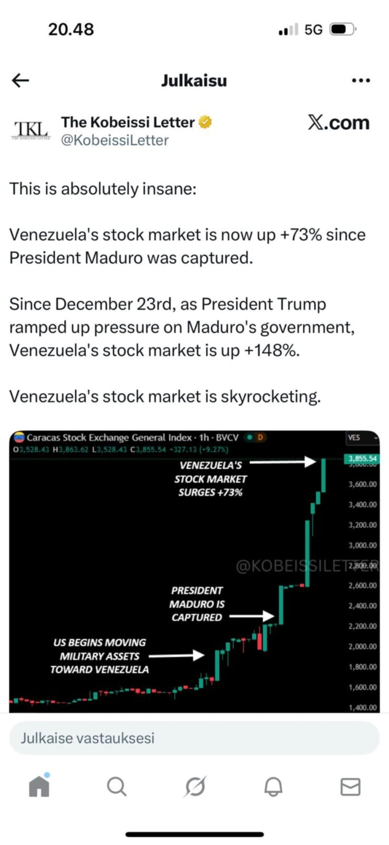 Tuli mieleen sellainenkin skenaario, että Trump toteuttaisi eräänlaisen mediaoperaation, jolla saa Tanskan kansan kannattamaan Grönlannin ”myyntiä”. Trump kun tunnetusti tykkää aiheuttaa hämmennystä, hän ilmoittaisi maksavansa esimerkiksi 600 miljardia dollaria Grönlannista (joka voi olla vielä jopa alakanttiin jos katsoo millaisia mineraalvarantoja Grönlannissa on). Sitten Trump sanoo, että Tanska voisi jakaa sen rahan tanskalaisille ”kansalaisosinkona” eli noin 100 000 dollaria per naama. Ei menisi kauaa, kun kansan syvät rivit asettuvat tukemaan ”myyntiä”. Loisi muuten valtavan likviditeetin Tanskan osakemarkkinoille, eikä ehkä olisi huono idea siinä mielessä tarkkailla Tanskan pankkisektoria, ehkä lisäksi myös vähittäiskauppoja ja rakennussektoria. Trumpilla on tunnetusti tapana saada mitä haluaa. Liitteenä kuva, mitä tapahtui Venezuelan osakemarkkinoille.