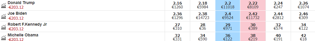Miulla on USA:N vaaleihin vihdoin peli-idea, joskaan tuottovaateeni ei ainakaan vielä ylity. Robert F Kennedy Jr:ää shorttaamalla on imo printtaamassa rahaa. Vaikka sekä Sleepy Joe että Stable Genius kuolisivat, Robert Jr:ia ei valita. Jenkkien seuraavissa vaaleissa valitaan joko republikaani tai demokraatti, ei riippumatonta. Jotan Michelle O:ta en missään tapauksessa lähtisi näillä tuotoilla shorttaamaan, koska jos Biden kuolee vanhuuteen (maailman laadukkainkin lääkitys auttaa vain niin pitkälle kuin auttaa) pakasta voidaan hyvin nostaa Musta Pirkko.