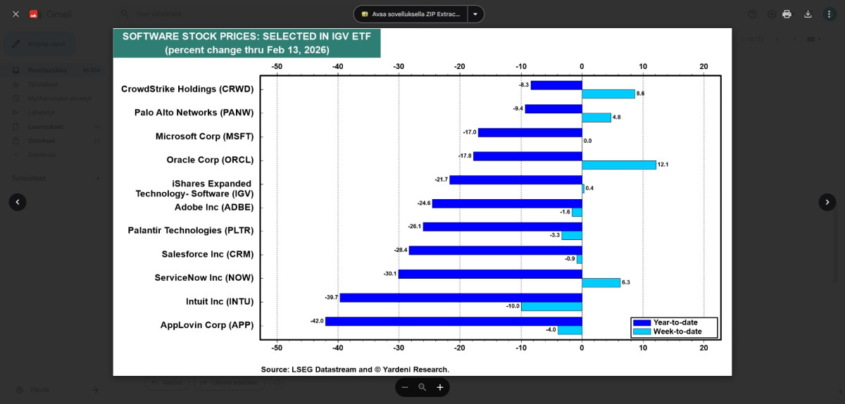 Viime viikolla sijoittelijat alkoivat - ainakin kurssikehityksen perusteella - poimia romahtaneiden ohjelmisto-osakkeiden joukosta kuitenkin niitä, jotka saattavat sittenkin jotenkin hyötyä AIstä tuhon sijasta: ORCL, NOW, CRWD, PANW.