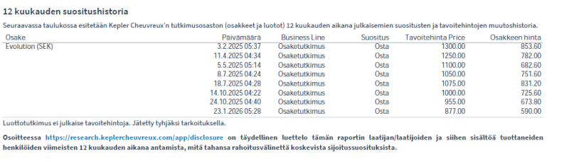 Noiden lukujen perusteella itse pysyttelen erossa Evolutionista vielä tällä arvostuksella. Firma ei ole kallis, mutta on laskusuhdanteessa, erittäin hankalalla alalla koska regulaatio ja ESG-valaat pysyvät erossa mikä vähentää nousun mahdollisuutta.