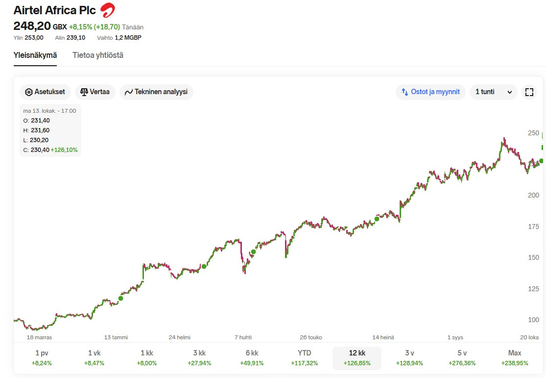 Airtel Africa plc on brittilistattu teleoperaattori, joka tarjoaa mobiilipalveluita, datayhteyksiä ja mobiilirahaa noin 14 maassa Afrikassa (esim. Nigeria, Kenia, Uganda, Tansania, DRC, Gabon).Heidän pelikenttä on valtava: Afrikan väestö siis kasvaa, kaupungistuminen kiihtyy, mobiililaitteet savimajoissa yleistyvät — eli markkinat odottavat isoahkoa loikkaa. Asiakasmäärä on jo yli 166 miljoonaa viimeisimpien raporttien mukaan.