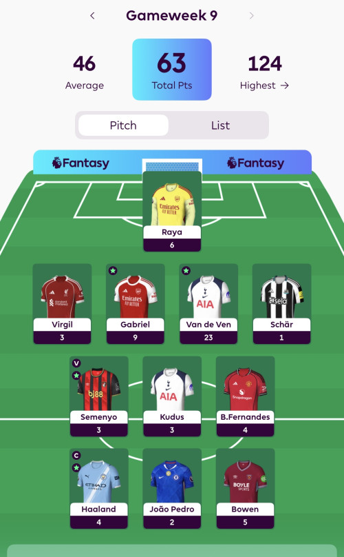 Ah, ollaan taas siinä vaiheessa kautta, että mieleen hiipii appin poisto ja pakeneminen vuorille. 32pts kasassa, Sakan ja Brunon lisäksi huomenna vielä kaksi pelaajaa. Haalandittomuus tuli tällä(kin) kertaa kalliiksi. Onnittelut Almanakalle Haaland + Reijnders kombinaatiosta. Omia pelaajia katsoessa voi olla kiitollinen, että wildcard tulee jo kolmen kierroksen jälkeen.