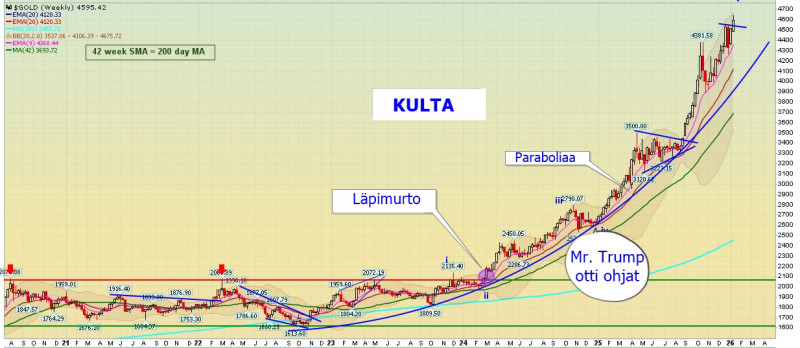 Mitä sitten esim. kullan jatkokehitykseen tulee, niin "selvännäkijä" Dr. Ed Yardeni julkaisi vastikään oman ennusteensa sen kehityksestä: targetti 2026 on 5000 USD ja targetti 2028 jopa 10000 USD, että parahultaisia lisäyspaikkoja vissiin tarttis katsella. Nythän se heiluu noin 4300 USD. Alla myös kuva S & P 500:n ja kullan pitkästä kehityksestä. Good luck!