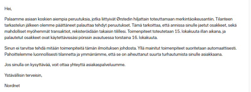 Noniin. Reilupeli-kerho kokoontui, ja totesi 5 päivää allokaation antamisen jälkeen, että osakkeet otetaan merkitsijöiltä pois, jotta saadaan isommat merkinnät Dansken parhaille asiakkaille. Viime perjantaina tililleni tulleet osakkeet siis otettiin sieltä pois. Lopputuloksena olen isosti Orstedia shorttina.