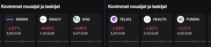 Tuplanegari salkkuun KH Groupilta, pidän Haglundin valintaa toimitusjohtajaksi tosi outona. Okei, voi olla muutosjohtaja joka myy turhat palaset ja siirtyy sitten muualle, mutta vaikea nähdä mitä RKP:n ex-pomo joka ei kelpaa minnekään saisi aikaiseksi. Toivottavasti olen väärässä ja "Hopeakieli"-Calle myy Indoorin johonkin positiiviseen hintaan. Citycon myös kurssihälytti, elpyi tosin vähän (samoin kuin KH Group) iltaan näköjään hälystä.