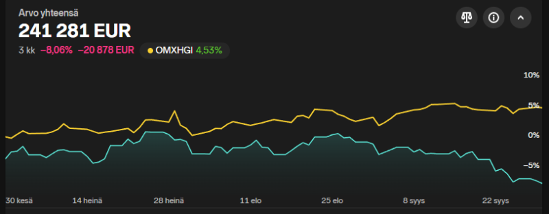 Tässä käyrämäyrää viimeiseltä kolmelta kuukaudelta - laskun ja lisäysten myötä sijoitusaste taas rapsakka 216%