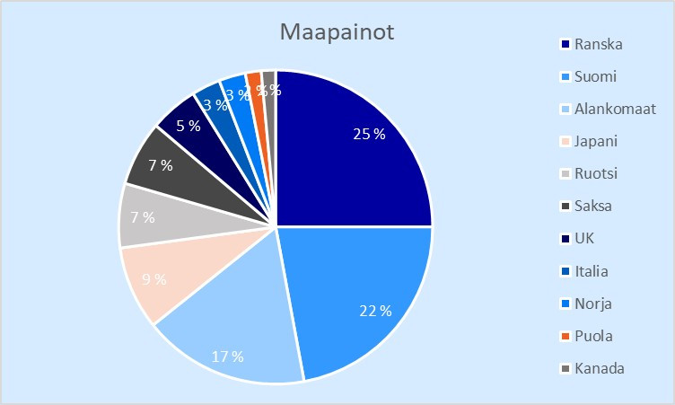 Ranska on jo salkkuni suurin pörssi. Alankomaat on kolmantena, mutta koko paino tulee yhtiöstä, joka on kreikkalainen (Theon). Japanin painoa kasvattaisin entisestään mielelläni, mutta päävedot Japaniin lähtivät kunnon lentoon neljänneksen aikana ja keventelin niitä useampaan otteeseen hinnan noustessa vaativaksi.