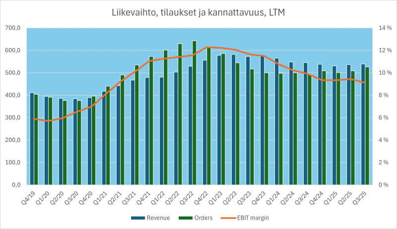 Tilauksia kertyi hiukka vähemmän Q3 kuin H1 keskimäärin, mutta kannattaa huomata lokakuussa ilmoitetut merkittävät yli 300m euron tilaukset, jotka eivät näissä luvuissa vielä näkyneet. Jos markkinat eivät keskity kannattavuusohjeistuksen puuttumiseen, nähdään varmaan ihan hyvä pomppu tänään.
