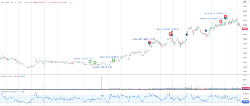Viimeiset Red Violetit meni itseltä myyntiin marraskuussa hintaan 57,65 USD. Q3-tuloshan oli vahva ja sen myötä osake kävi pikaisesti jopa yli 60 taalassa. Suurempi osa myynneistä tapahtunut kuitenkin jo aiemmin, selvästi kauempana huipuista. Miten positio skaalataan takaisin ylös? Hintalappu ei ole vielä kovin lähellä houkuttelevaa, mutta toisaalta en usko sen tulevan lähellekään aiempia ostotasojani. Osake nyt korjannut 15 % viimeisestä myynnistä, enkä usko fundamenttien heikkenevän merkittävästi tulevissa raporteissa. Toistaiseksi jään todennäköisesti odottelemaan ja hyväksyn, jos osake karkaa uudestaan tavoittamattomiin.