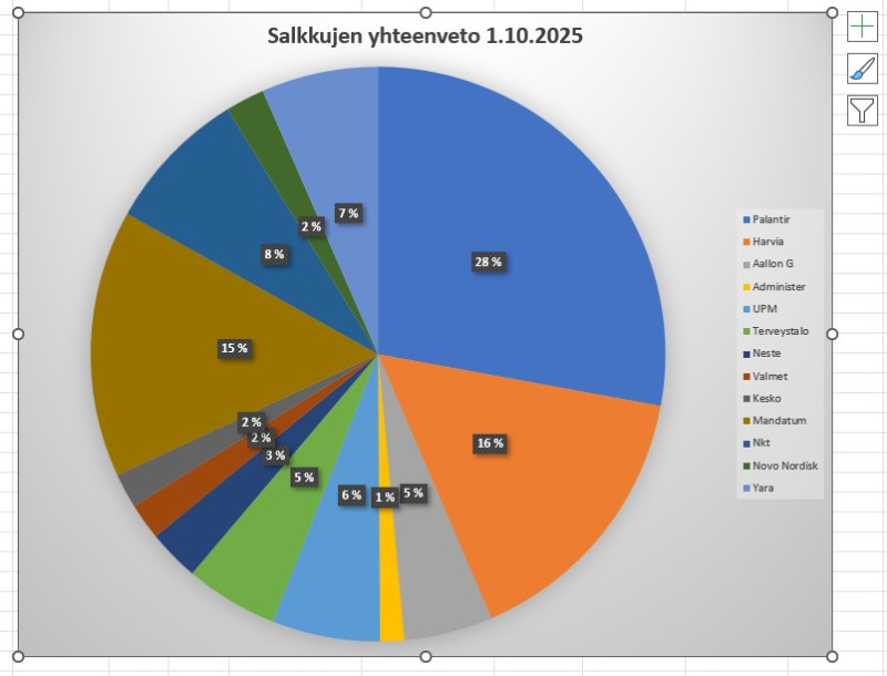 Q3 oli salkulle aika hiljainen lopulta. Pääpositiot olleet aika rauhassa Harvian dippiä lukuunottamatta joten tuotto on hyvin lähellä Q2 loppua. Vuosi toki valtavan hyvä edelleen kokonaistuoton ollessa yhdistetyille salkuille +42,6%.